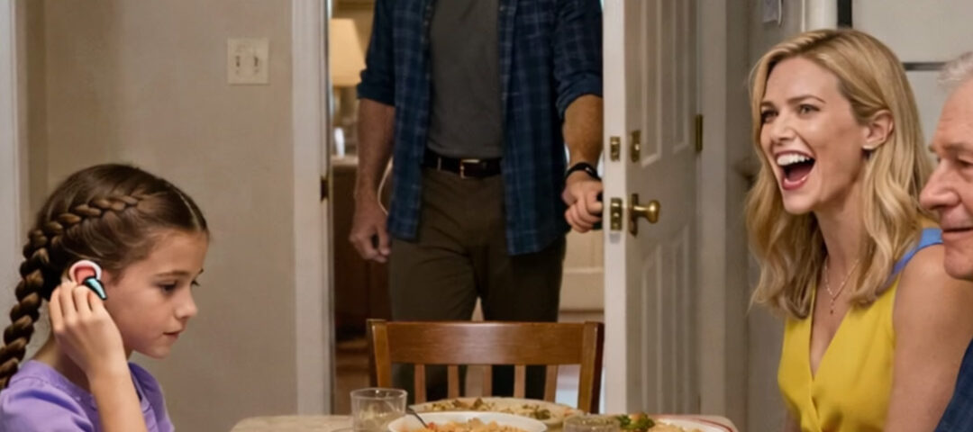 I didn’t raise my voice that night. I didn’t argue. I didn’t even move. I just watched my six-year-old daughter, Emma, fold inward at our dining table—shoulders rounding, chin dipping—while my sister laughed at the tiny device behind her ear like it was a punchline.