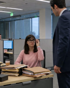 There I sat in the corner—an unremarkable intern in plain clothes, buried behind overstacked files, wearing cheap black-rimmed glasses and the expression of a girl nobody had bothered to remember.