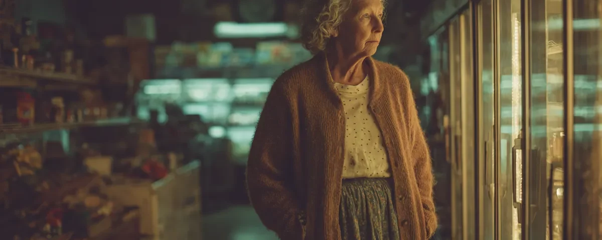 A woman stood there, maybe 70 years old, tall and thin with a long gray braid draped over one shoulder. She wore a floral scarf around her neck, and her sharp blue eyes flicked between me and the fridge with an intensity that made me uncomfortable.